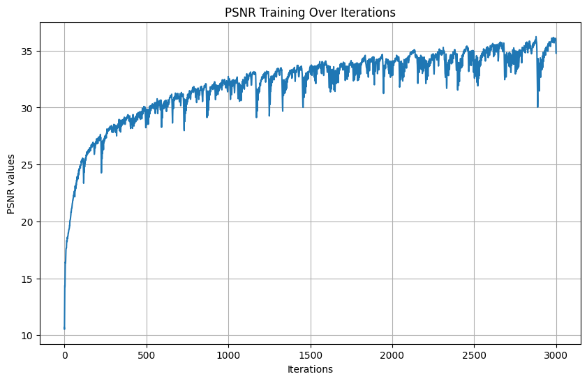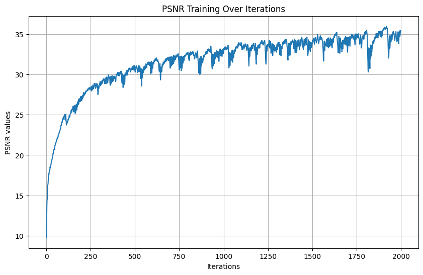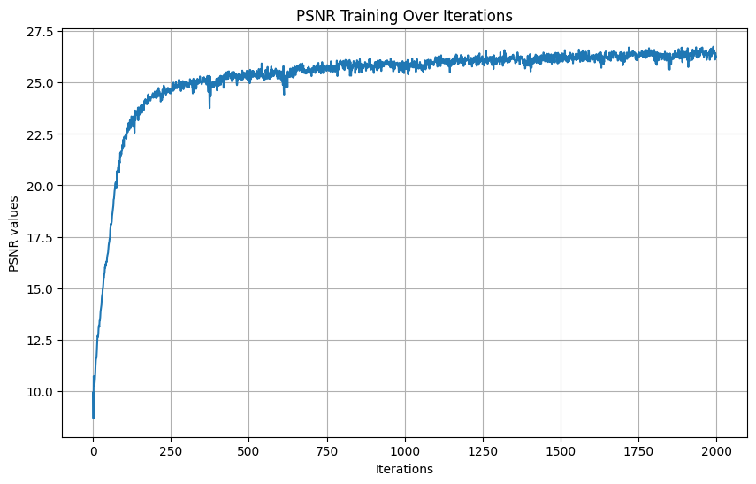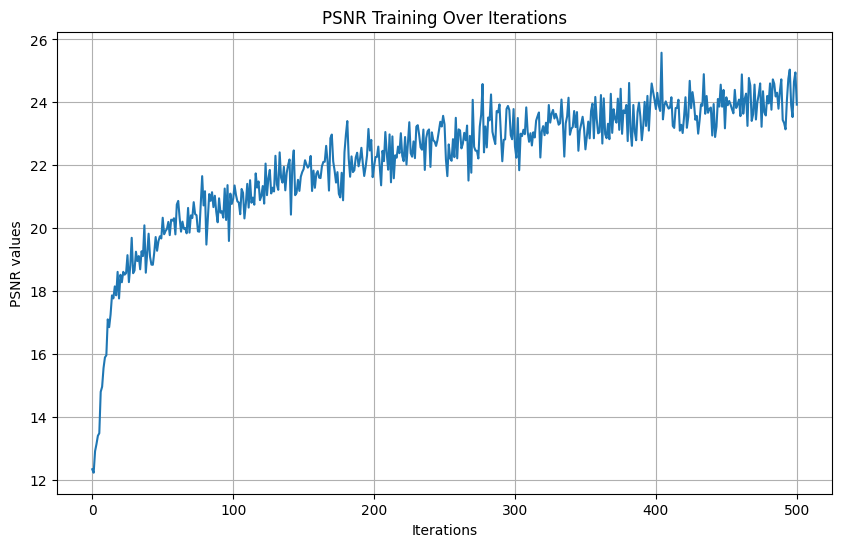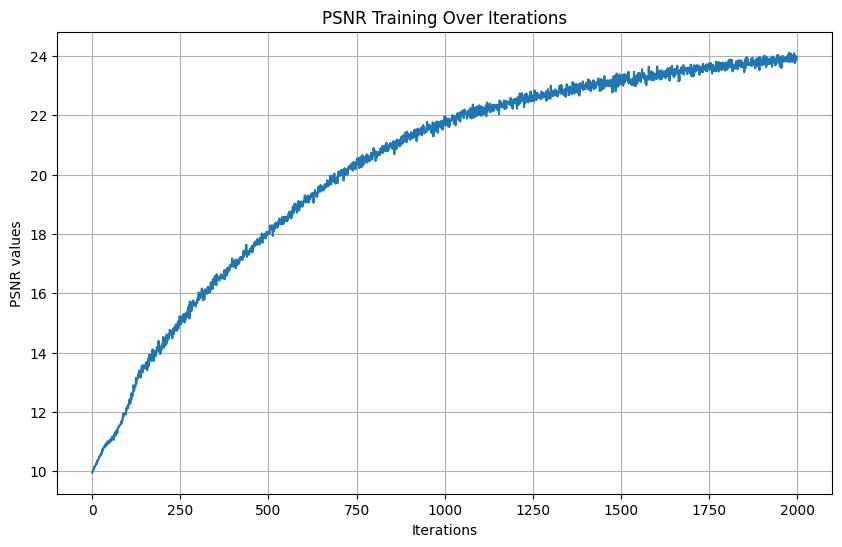 sigma is density, c is color, and delta is the interval width between points on a ray. Due to memory errors, we were only able to make our batch size 1000– 1000 rays total per iteration. We ran for 5000 iterations, with a learning rate 5e-4. This took about 20 minutes. We were able to surpass the required PSNR of 23. If we had more compute units, we could have increased batch size and iterations to further increase performance. T This is the actually the validation PSNR curve (it says training but that is an incorrect title).