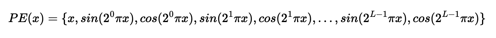 The positional encoding expands the input dimensions by creating more channels with sinusoidal functions. L defines the maximum frequency in the sinusoidal functions. For example, a 2D coordinate in this case with L = 10, becomes dimensions + 2 (for sin and cos) * L * dimensions = 2 + 2 * 10 * 2 = 42.
