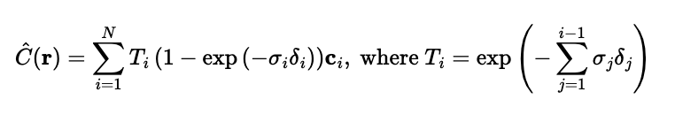 We implemented a NeRF architecture that builds upon the principles discussed earlier. PE is the same as defined in part 1, but instead is fed 3D spatial coordinates instead of 2D, and ray directions are transformed into a higher-dimensional space to enable the network to capture variations in the scene. The network itself is significantly deeper, consisting of many repeated linear layers. This depth allows the model to effectively learn the intricate relationships between geometry and appearance within the scene. The inputs to the network are the 3D coordinates of the points sampled along each ray and the directions of the rays. The outputs are density, which describes the opacity or how much light is absorbed or scattered at each sampled point, and the RGB color values. Finally, we implemented a volume rendering function to synthesize the final pixel colors. This function integrates the predicted densities and RGB values along each ray to render photorealistic views of the scene. We used the following discrete approximation equation for rendering.