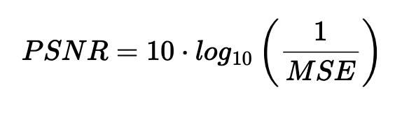 In training, Peak signal-to-noise ratio (PSNR) is a good metric to assess the reconstruction of an image. The higher the PSNR, the better – the more signal and less noise. PSNR is defined as follows: